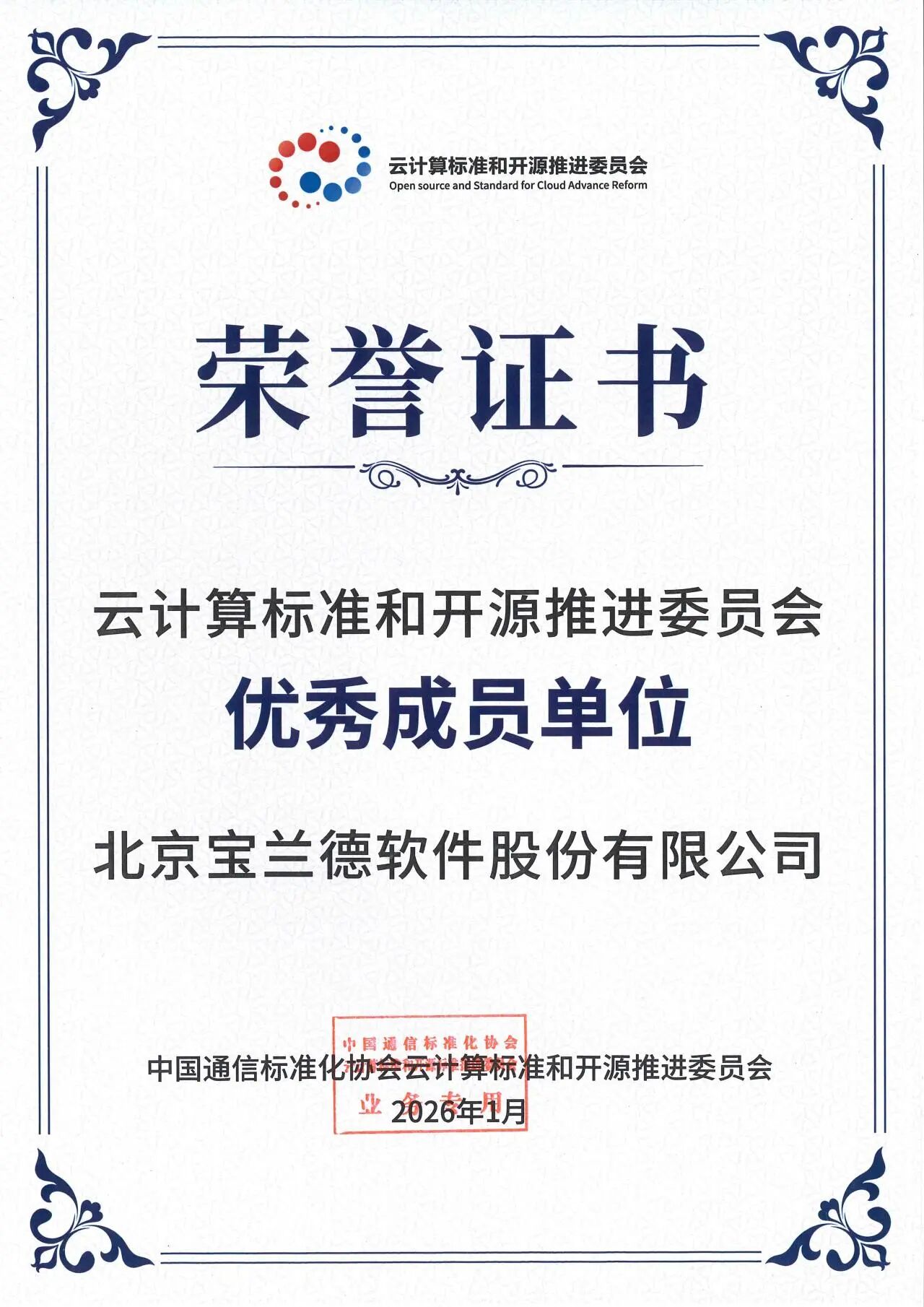 1月28日,由中國(guó)通信標(biāo)準(zhǔn)化協(xié)會(huì)云計(jì)算標(biāo)準(zhǔn)和開(kāi)源推進(jìn)委員會(huì)主辦的2025年度工作總結(jié)會(huì)在北京隆重召開(kāi)。議全面回顧了TC608在過(guò)去一年中在推動(dòng)云計(jì)算標(biāo)準(zhǔn)體系建設(shè)、促進(jìn)開(kāi)源技術(shù)創(chuàng)新及產(chǎn)業(yè)協(xié)同發(fā)展等方面取得的重要成果,并對(duì)在2025年度表現(xiàn)突出的成員單位和專家予以表彰。會(huì)上,寶蘭德憑借其在云計(jì)算標(biāo)準(zhǔn)制定與開(kāi)源社區(qū)建設(shè)中的卓越貢獻(xiàn),榮獲“優(yōu)秀成員單位”稱號(hào)。